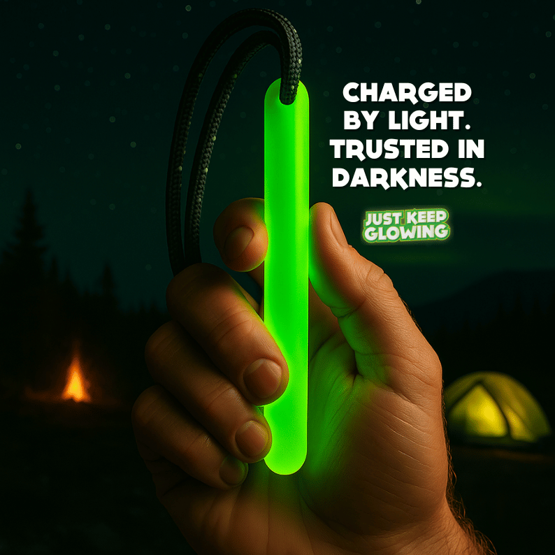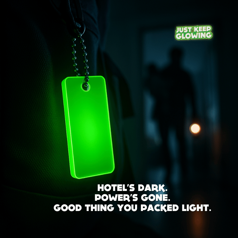 We started Just Keep Glowing after being stuck in a dark hotel room during a surprise power outage while on vacation. No flashlight. No candles. Just darkness. So we built what we wish we had — a lightweight, TSA-friendly glow kit that works anywhere, needs no batteries, and never expires.